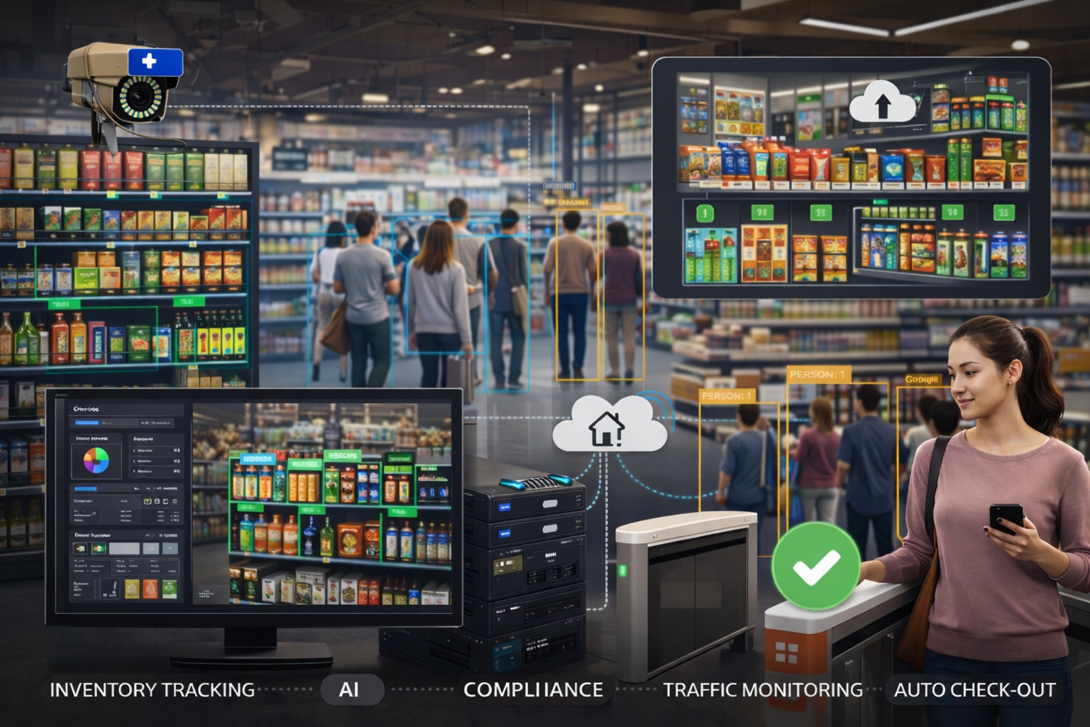 - System uses computer vision and AI to address challenges in physical retail /brand store by automatically keeping track of the inventory of the products placed on retail store shelves. This is achieved by capturing live feeds from retail cameras or newly installed cameras, processing live video feeds form the camera locally via an edge node and then relaying the inventory data to cloud server for further processing.