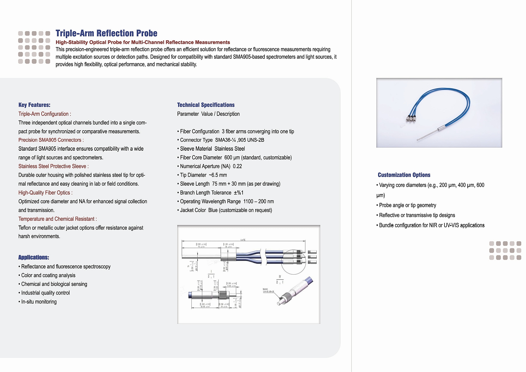 This precision-engineered triple-arm reflection probe offers an efficient solution for reflectance or fluorescence measurements requiring